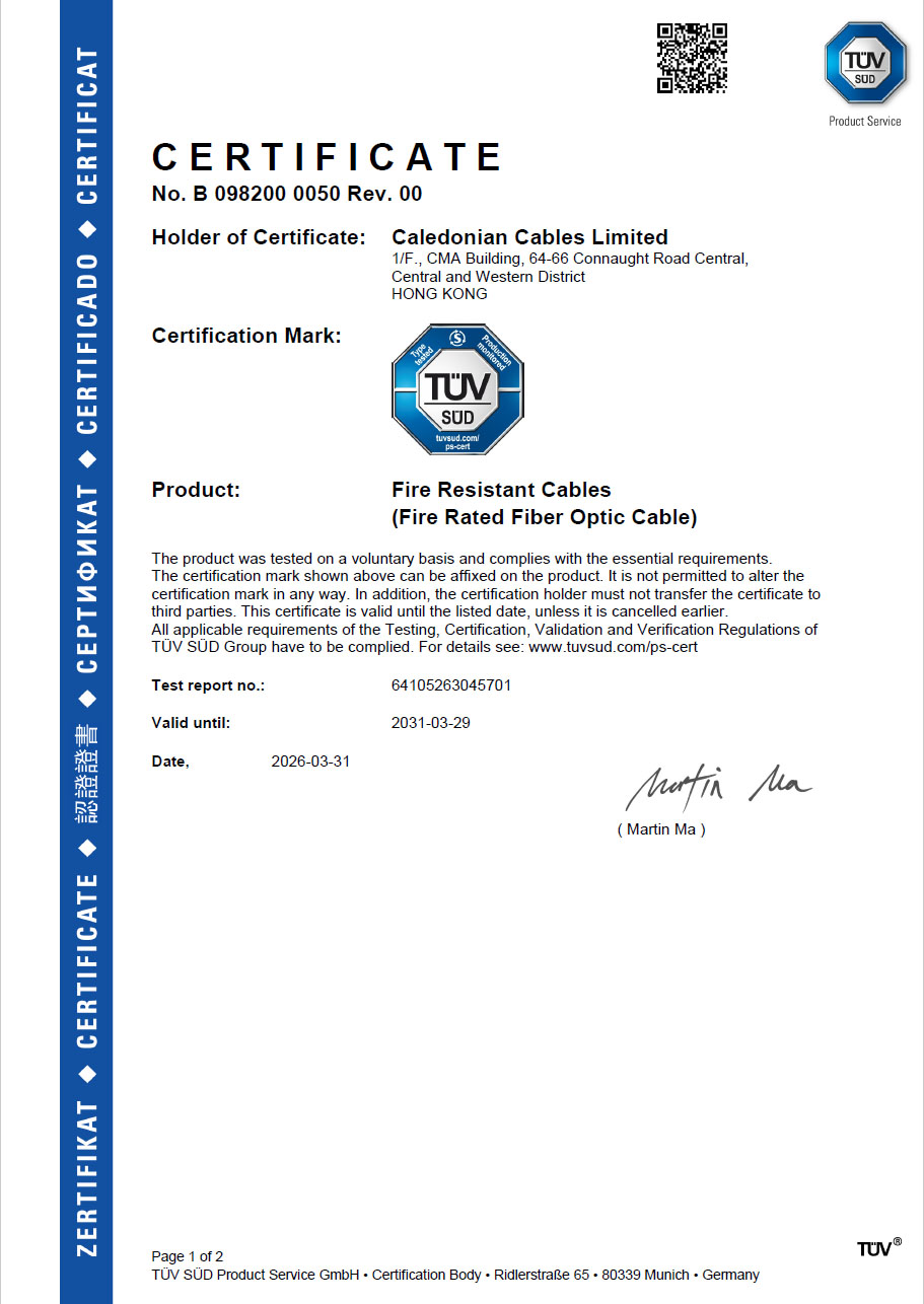 Fire Rated Fiber Optic Cable TUV Certificate