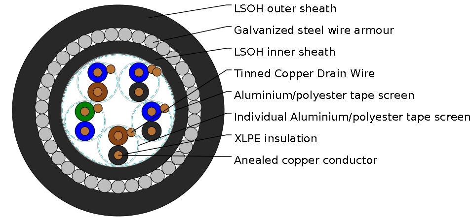 The armoured LSOH versions (Part 1 Type 2) are generally used when the risk of mechanical damage is increased. The galvanised steel wire armour provides excellent protection. Generally used within industrial process manufacturing plants for communication, data and voice transmission signals and services, Also used for the interconnection of electrical equipment and instruments, the LSOH sheath can reduce toxic smoke and fume emission.