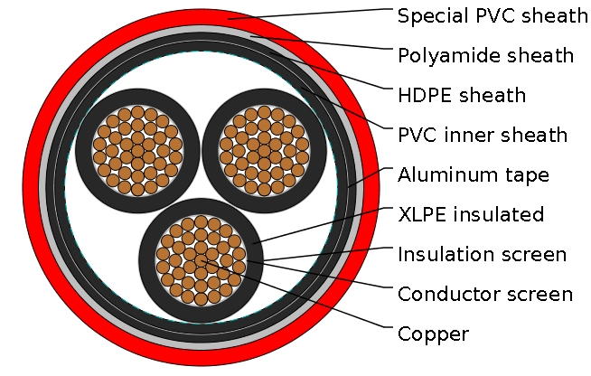 Conductor: Stranded bare copper (class 2)Conductor screen: This will be an extruded layer of semi-conducting crosslinkable compound applied under simultaneous triple extrusion process over the conductor along with the insulation and the insulation screen.