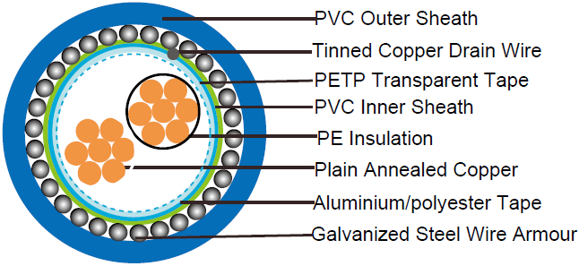| No. of Pairsx2 xCross Section | Nominal Insulation Thickness | Nominal Inner Sheath Thickness | Nominal Overall Diameter Over Inner Sheath | Nominal Armour Wire Diameter | Nominal Outer Sheath Thickness | |