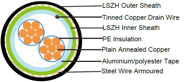 EN 50288-7 PE armour Multicore cables are generally use for indoor installation and suitable for wet and damp areas. The galvanized steel wire armour provides excellent protection. Generally, the cables are used within industrial process manufacturing plants for communication, data and voice transmission signals and services. Also used for the interconnection of electrical equipment and instruments, the LSZH sheath can reduce toxic smoke and fume emission.