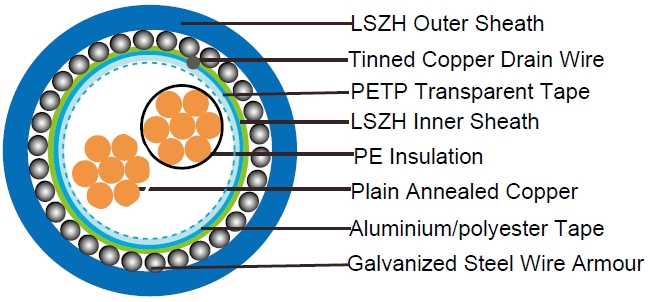 - Outer Sheath: Thermoplastic LSZH compound type LTS3 as per BS 7655-6.1 (Thermosetting LSZH compound typeSW2-SW4 as per BS 7655-2.6 can be offered.). UV resistance, hydrocarbon resistance, oil resistance, anti rodent and anti termite properties can be offered as option.