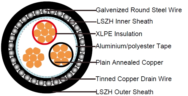 - Outer Sheath: Thermoplastic LSZH compound type LTS3 as per BS 7655-6.1 (Thermosetting LSZH compound typeSW2-SW4 as per BS 7655-2.6 can be offered.). UV resistance, hydrocarbon resistance, oil resistance, anti rodent and anti termite properties can be offered as option.