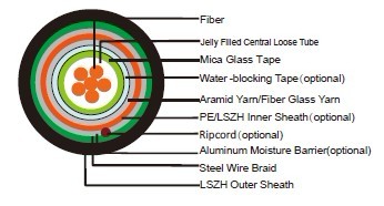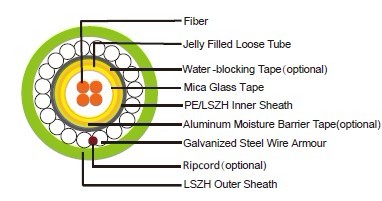 Fire barrier: The jelly filled tube with up to 24 fibers is wrapped with a fire blocking mica glass tapes.