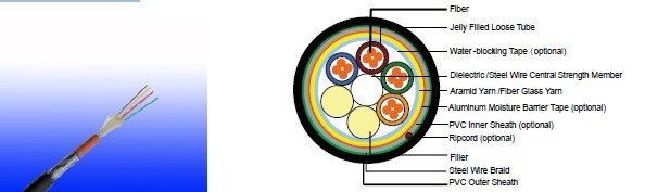 Fibers: Singlemode and multimode fibers, with loose tube technology.Structure: The cable consists of 5 to 36 fibers containing tubes or fillers stranded in up to 3 layers around a central strength member and bound under a PVC sheath. Each tube contains 4 -12 fibers, which is filled with water blocking gel.