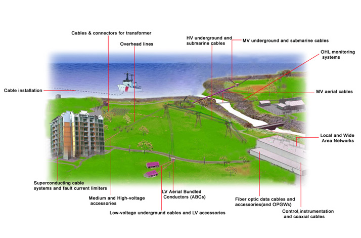 Low-voltage underground cables and LV accessories: Uses for plant applications, and subscriber distribution. Accessories include LV cabinets and straight and branch joints.