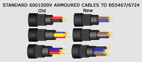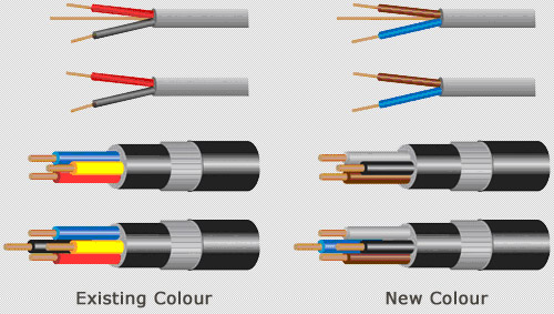 The old cable colour code, i.e. red, yellow and blue for phase conductors and black for the neutral conductor, are to be replaced by the new one, i.e. brown, black and grey for phase conductors and blue for the neutral conductor, as specified in Table 1. Circuits for new installations should be wired in new colour coded cables.
