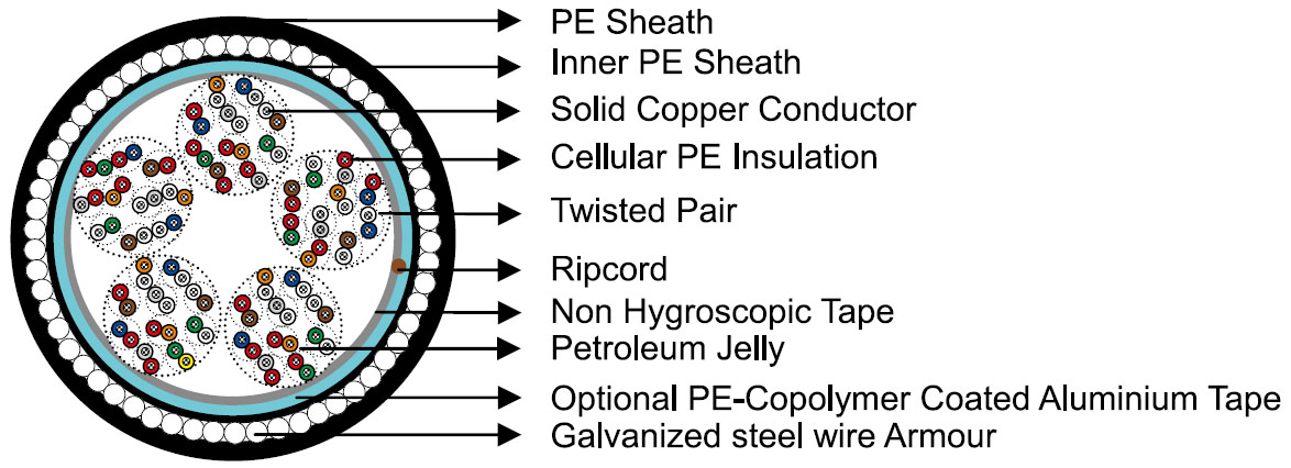 The cable core interstices are filled with petroleum jelly to avoid longitudinal water penetration within the cable.
