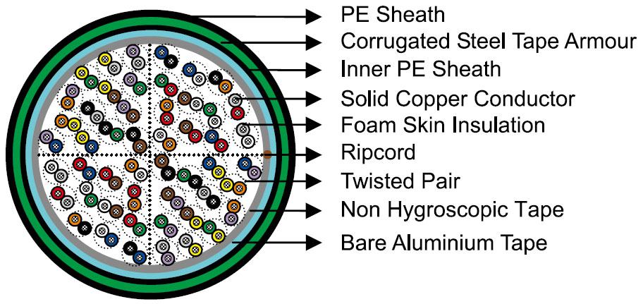 The GR-421 cables are designed for use in access or trunk networks, from telephone exchange to subscriber area. The cables are suitable for installation in ducts, direct burial in the ground and also for aerial installation with integral suspension strand.Jelly filled option is for subscriber’s cables installed underground or along the edge of pavement. An armoured option is offered for direct burial installations where additional mechanical or rodent protection is required. A figure-8 self support option is offered for aerial installation.