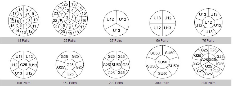 Various arrangements of pairs, units, groups, and super units are possible for standard non-screened telephone cables both filled and aircore.