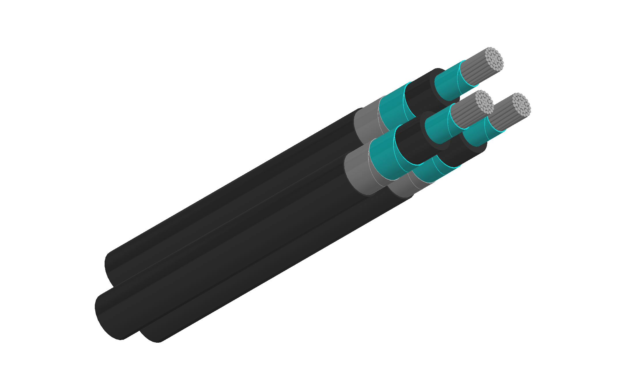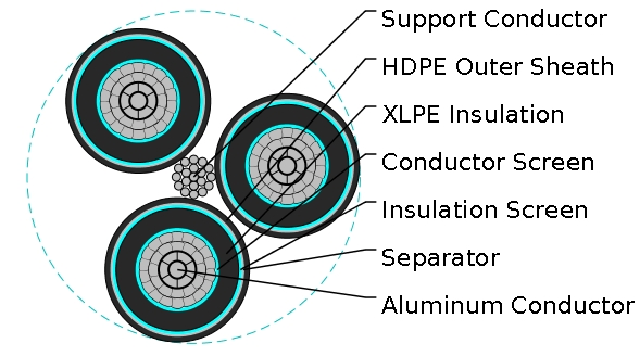 Three XLPE insulated cores are bundled around the AAAC/1120 support conductor in a right hand lay.
