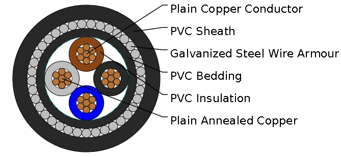 BS 6346 600/1000V PVC Insulated, PVC Sheathed Armoured Power Cables are intended for use in fixed installations in industrial areas, buildings and similar applications.