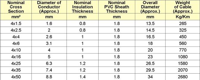 | Nominal Cross Section | Diameter of Conductor (Approx.) | Nominal Insulation Thickness | Nominal PVC Sheath Thickness | Overall Diameter (Approx.) | Weight of Cable (Approx.) |