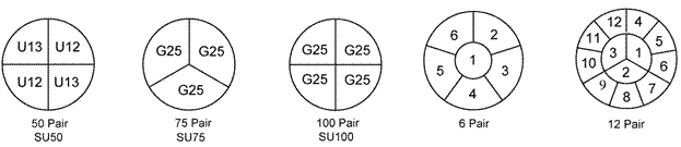 对于600对以下电缆, 25对的组通过绑带颜色进行识别,顺序与线对识别的序列相同。组1为白-蓝绑带,组2为白-橙绑带,等