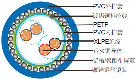 PVC铠装阻燃系列(第1部分 类型2)线缆通常用于室内安装和潮湿的地方。通常应用于当机械损伤的风险增加。镀锌钢丝铠装提供了优秀的保护。通常用在工业过程制造工厂为通信、数据和声音传输信号和服务,也用于互连的电气设备和仪器, PVC护套可以减少有毒烟雾和烟气排放。