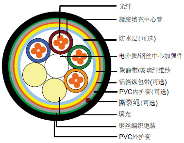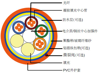 覆盖在聚乙烯表面的实心或者绞合钢丝通常被用作中心加强件,如果不需要金属结构,玻璃纤维增强塑料(FRP)也通常用作加强件。 |