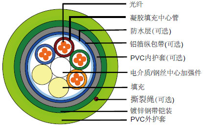 该电缆是由5-36根包含有导管和填充物的光纤组成,同时这些导管和填充物在中心加强件周围绞合达到3层以及被捆绑在低烟无卤护套下面。 |