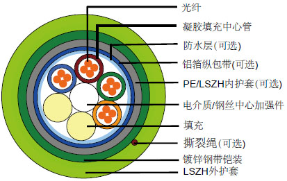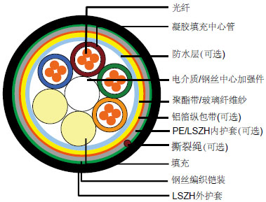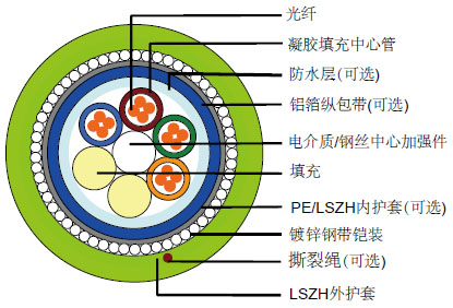 该电缆是由5-36根包含有导管和填充物的光纤组成,同时这些导管和填充物在中心加强件周围绞合达到3层以及被捆绑在低烟无卤护套下面。 |