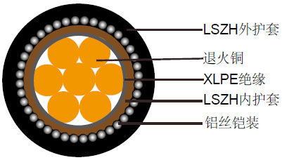 单芯600/1000V XLPE绝缘, LSZH护套, 铠装电力缆线缆主要应用于发电站、公共交通客运系统、机场、石化工厂、酒店、医院、高层建筑等的配线电缆。
