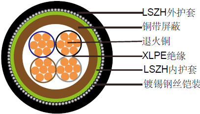 IEC60502标准4芯600/1000V XLPE绝缘, LSZH护套, 铜带屏蔽钢丝铠装电力缆大大减少电磁噪音干扰,尤其是在变速传动(VSD)应用程序和在生产时固定导体之间的干扰。屏蔽相邻导体的电导率1/10, 这个范围的变速转动线缆有效抑制辐射并进行了射频排放。
