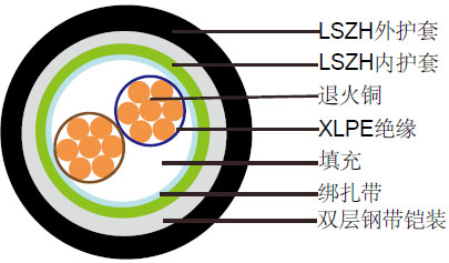 600/1000V XLPE绝缘, LSZH护套, 双钢带铠装电力缆 (2芯)