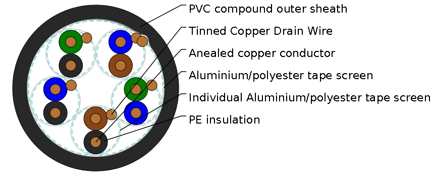 Aluminium/polyester tape is applied over each pair metallic side down in contact with tinned copper drain wire, 0.5mm² |
