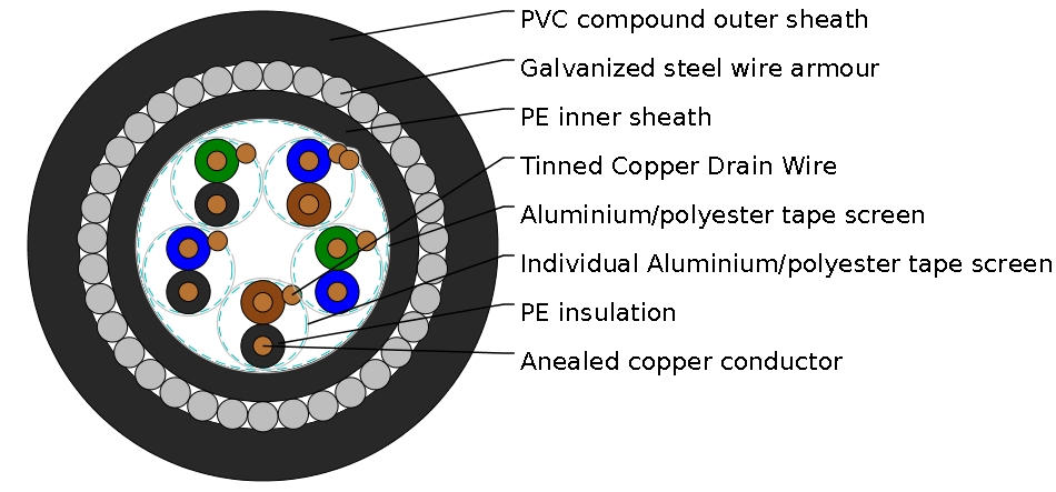 The armoured versions (Part 1 Type 2) are generally used when the risk of mechanical damage is increased. The galvanised steel wire armour provides excellent protection. Generally used within industrial process manufacturing plants for communication, data and voice transmission signals and services, Also used for the interconnection of electrical equipment and instruments, typically in petroleum industry. The armored versions are generally use for outdoor installation for direct burial or installed in the duct and suitable for wet and damp areas.