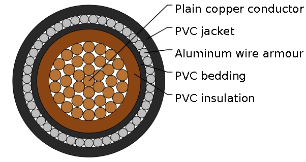 | Filler(optional) Binder Tape(optional) Inner Sheath/ Bedding Armour Outer Sheath | PVC or Polypropylene yarn Polyester (Mylar) tape PVC (Polyvinyl Chloride) Single Core: AWA (Aluminum WireArmour) Multi Core: SWA (Steel Wire or Tape Armour) PVC(Polyvinyl Chloride), type TM1 | |