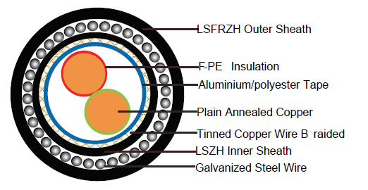 2*0.64mm (22AWG) Cu/F-PE/Al-foil screen/TCWB/LSZH/ GSWA/LSZH, UV resistance, FR to IEC 60332-3-24 Cat.C