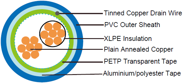 - Overall Screen: Aluminium/polyester tape is applied over the laid up pairs metallic side down in contact with tinned copper drain wire, 0.5mm2