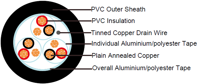 - Individual Screen: Aluminium/polyester tape is applied over each pair metallic side down in contact with tinned copper drain wire, 0.5mm2
