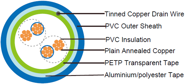 - Overall Screen: Aluminium/polyester tape is applied over the laid up pairs metallic side down in contact with tinned copper drain wire, 0.5mm2