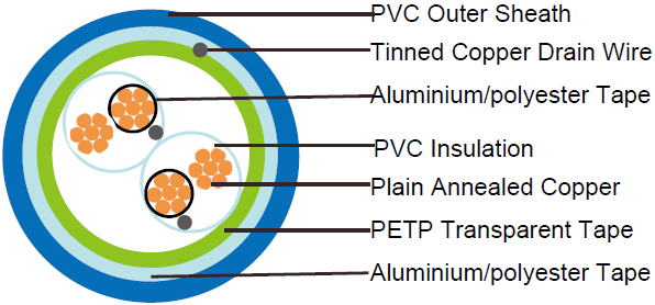 - Overall Screen: Aluminium/polyester tape is applied over the laid up pairs metallic side down in contact with tinned copper drain wire, 0.5mm2