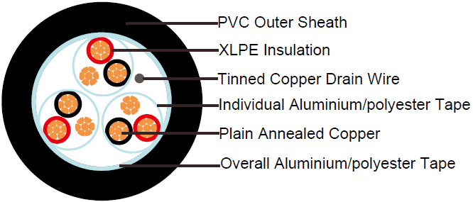 - Individual Screen: Aluminium/polyester tape is applied over each pair metallic side down in contact with tinned copper drain wire, 0.5mm2