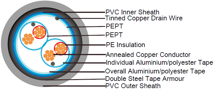 - Individual Screen: Aluminium/polyester tape is applied over the laid up pairs metallic side down in contact with tinned copper drain wire, 0.5mm2, covered with extruded PVC.