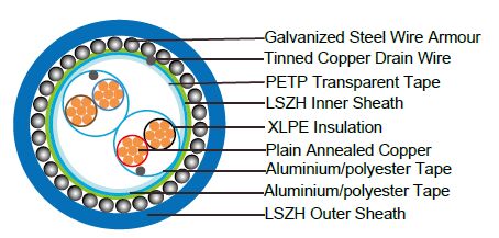 - Outer Sheath: Thermoplastic LSZH compound type LTS3 as per BS 7655-6.1 (Thermosetting LSZH compound type SW2-SW4 as per BS 7655-2.6 can be offered.). UV resistance, hydrocarbon resistance, oil resistance, anti rodent and anti termite properties can be offered as option.