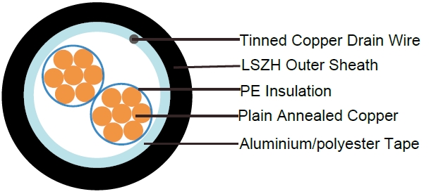 - Overall Screen: Aluminium/polyester tape with 0.5mm2 screen (7/0.3mm) tinned copper drain wire.