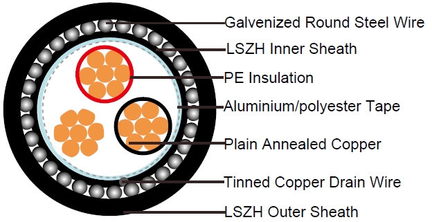 - Outer Sheath: Thermoplastic LSZH compound type LTS3 as per BS 7655-6.1 (Thermosetting LSZH compound typeSW2-SW4 as per BS 7655-2.6 can be offered.). UV resistance, hydrocarbon resistance, oil resistance, anti rodent andanti termite properties can be offered as option.