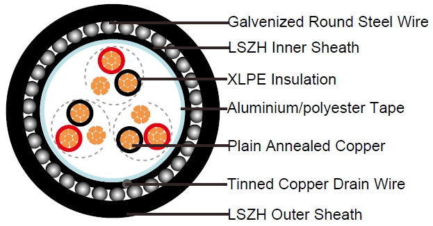 - Outer Sheath: Thermoplastic LSZH compound type LTS3 as per BS 7655-6.1 (Thermosetting LSZH compound type SW2-SW4 as per BS 7655-2.6 can be offered.). UV resistance, hydrocarbon resistance, oil resistance, anti rodent and anti termite properties can be offered as option.