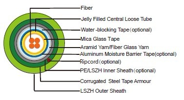Fire barrier: The jelly filled tube with up to 24 fibers is wrapped with a fire blocking mica glass tapes.