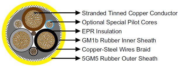 | Outer Sheath | Chlorinated rubbe type 5GM5, abrasion and tear resistant, oil resistant and flame retardant. |