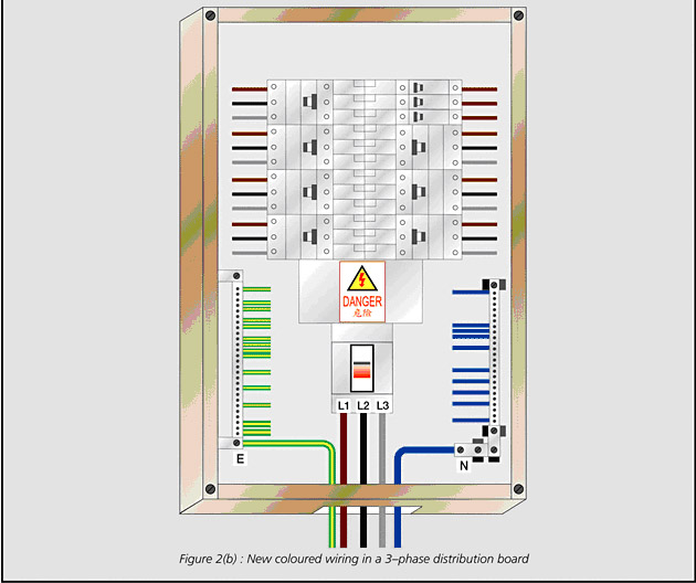 The old cable colour code, i.e. red, yellow and blue for phase conductors and black for the neutral conductor, are to be replaced by the new one, i.e. brown, black and grey for phase conductors and blue for the neutral conductor, as specified in Table 1. Circuits for new installations should be wired in new colour coded cables.