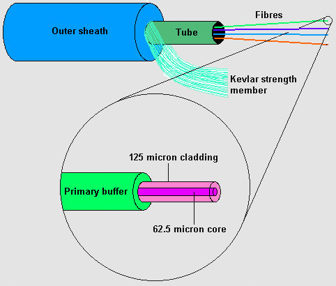 There are many different types of fiber cable; in this FAQ we will deal with one of the most common types, 62.5/125 micron loose tube. The numbers represent the diameters of the fiber core and cladding, these are measured in microns which are millionths of a metre. Loose tube fiber cable can be indoor or outdoor, or both, the outdoor cables usually have the tube filled with gel to act as a moisture barrier which stops the ingress of water. The number of cores in one cable can be anywhere from 4 to 144.