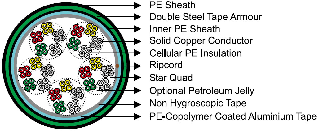 4 Cores are twisted into star quad. 5 star quads are stranded into a basic unit. 5 or 10 basic units each are stranded into one main unit. The star quads are grouped in units and stranded in layers to form the cable core. Standard make up is per DIN VDE 0816 in the Cable Make Up Diagram