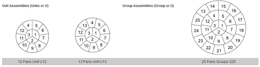 Various arrangements of pairs, units, groups, and super units are possible for standard non-screened telephone cables both filled and aircore.