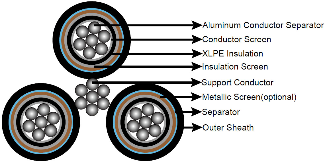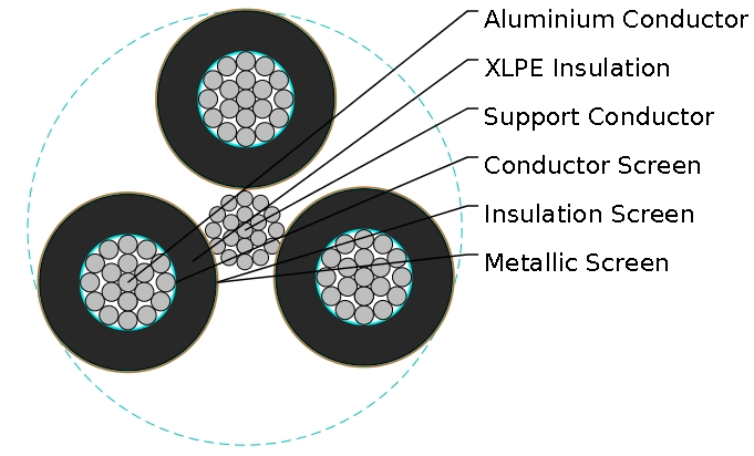 Three XLPE insulated screened cores are bundled around the galvanized steel wires in a right hand lay. |