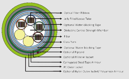 The cable consists of 12 to 648 fi bers containing tubes or fi llers stranded in up to 3 layers around a central strength member and bound under a PE jacket. Each tube contains 4 -12 ribbon fi bers. Solid or stranded steel wire coated with polyethylene is usually used as central strength member. Fiber glass reinforced plastics (FRP) will be used as central strength member if non metallic construction is required. Either aramid yarn or fi ber glass is wound around the tube to provide physical protection and tensile strength. The cable can be jacketed with either PE, PVC or LSZH though PE is the preferred option for water protection purpose. For direct burial, steel wire armour or corrugated steel tape armour is applied with an optional inner jacket of either PVC or PE. An optional Aluminium moisture tape can be incorporated under the jacket for water blocking and shielding purpose. An optional ripcord is located under the jacket to facilitate jacket removal.