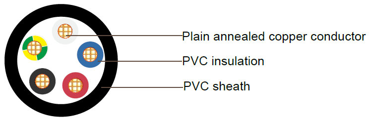 PVC Insulated, PVC Sheathed 4 core+E Unarmored Cables, 0.6/1kV