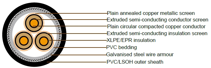 3.8/6.6kV Three Core Individual Screened & PVC/SWA/PVC Sheathed (Cu Conductor)